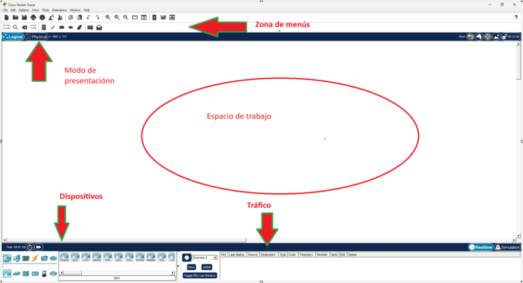 En este artículo de MyVlcsys exploramos algunos de los elementos más importantes de la interfaz de Cisco Packet Tracer, una de las herramientas más utilizadas para el aprendizaje y la simulación de redes. Abordaremos de forma clara qué información ofrece la zona de tráfico, cómo funciona la zona de presentación, y cuál es la finalidad de las pestañas Logical y Physical, dos vistas esenciales para comprender tanto la estructura lógica como la disposición física de una red.