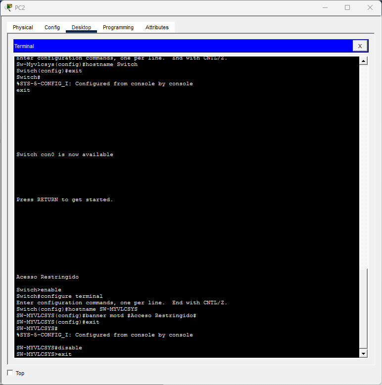 SW-MYVLCSYS(config)#banner motd # Acceso Restringido MYVLCSYS #