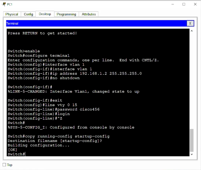 enable→ Entrar en modo con permisosconfigure terminal→ Modo de configuracióninterface vlan 1→ Seleccionar la VLAN de administraciónip address 192.168.1.2 255.255.255.0→ Poner IP al switchno shutdown→ Encender la interfazline vty 0 15→ Preparar acceso remoto (16 conexiones)password cisco456→ Poner contraseña: cisco456login→ Obligar a usar la contraseñacopy running-config startup-config→ GUARDAR TODO permanentementeInterface Vlan1, changed state to down→ La VLAN no tiene puertos activos (normal)Configured from console by console→ Confirmación de cambios[OK]→ ¡Guardado exitoso