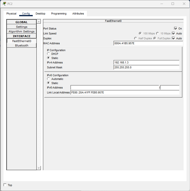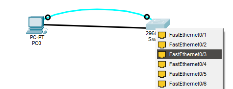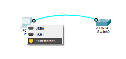 La conexión la estableceremos desde el puerto «FastEthernet0» de la computadora: