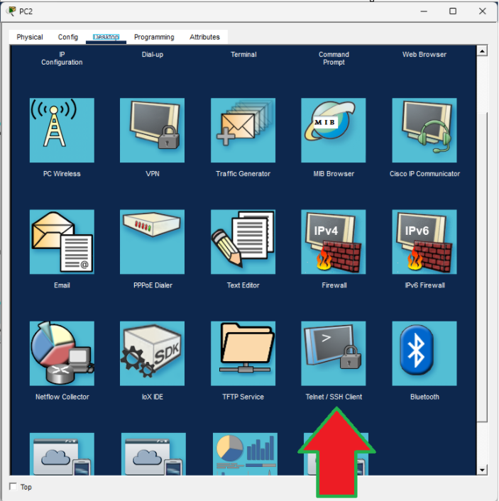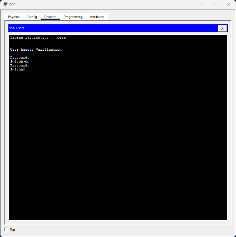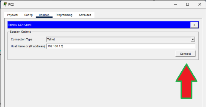 Nos solicitará el tipo de conexión y la dirección ip del host al que queremos conectar, en nuestro caso recordemos que es al switch, que recordemos que le establecimos como ip 192.168.1.2.