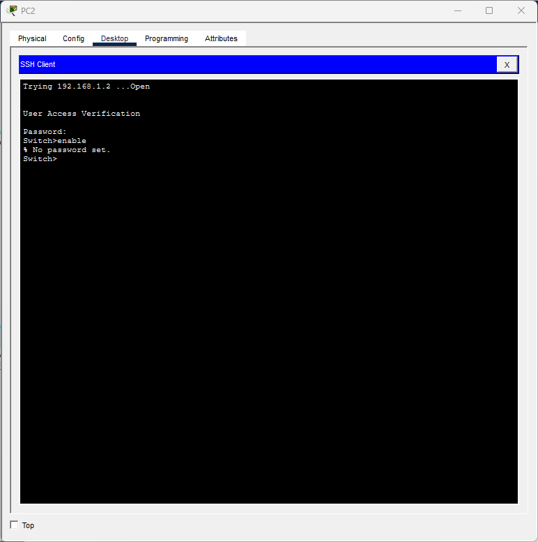 Cuando conectemos con el switch, nos solicitará las credenciales de conexión, pero podremos observar que cuando queremos entrar al modo configuración, nos indica que no establecimos ninguna clave para ello, y no nos deja configurar el switch:
