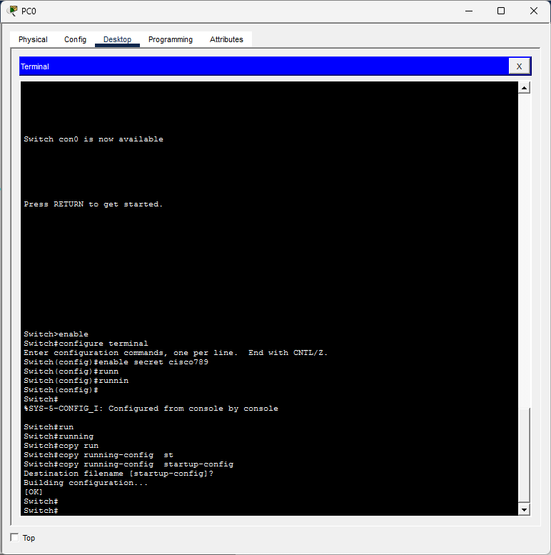 4. Switch(config)#enable secret cisco789 → Poner contraseña de administrador: cisco789